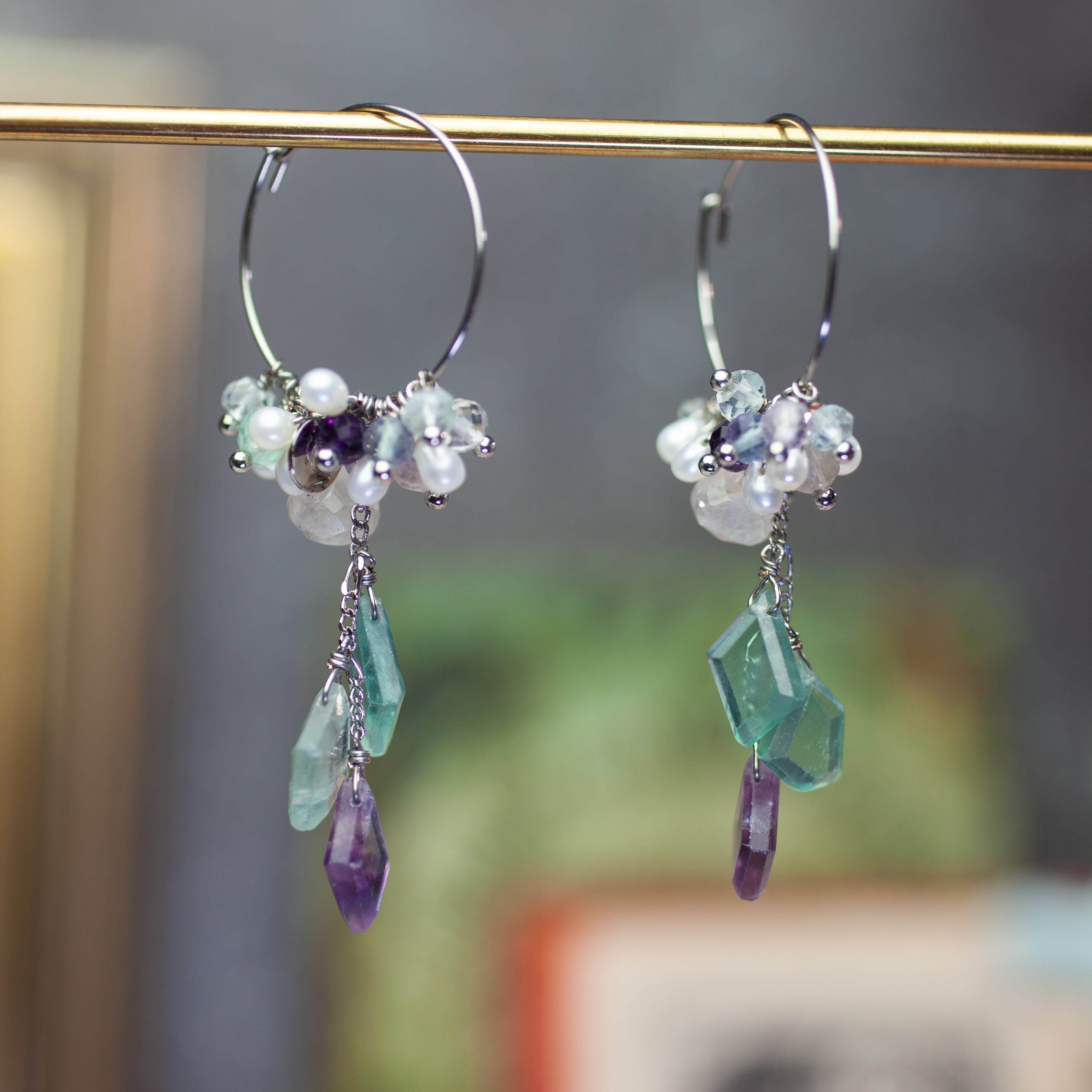 フローライト、パール、水晶、ヒマラヤ水晶、ハーキマー水晶で仕立てているので、あまり主張なくさりげなく耳元で揺れます